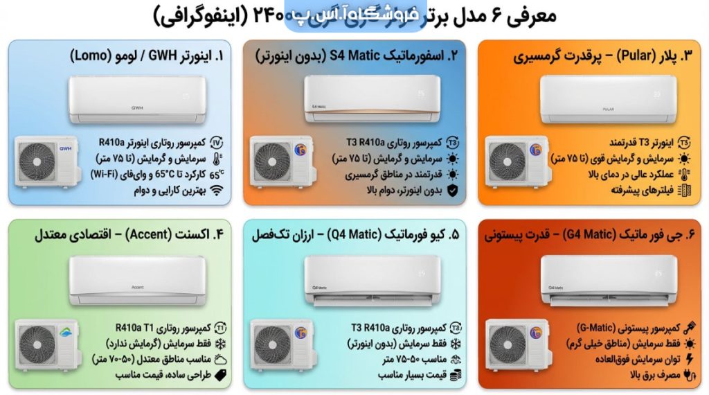 اگر بودجه محدودی دارید یا در منطقهای با آب و هوای معتدل زندگی میکنید، Accent 24000 را در نظر بگیرید. این مدل اقتصادی دارای کمپرسور روتاری T1 و گاز R410a است. طراحی مینیمال و قیمت مناسب از نقاط قوت آن است؛ با این حال گرمایش ندارد و برای مناطق سردسیر گزینه کاملی نیست. اکسنت برای شهرهای معتدل (تهران، شمال کشور) و فضاهای 50-70 متر مناسب است.