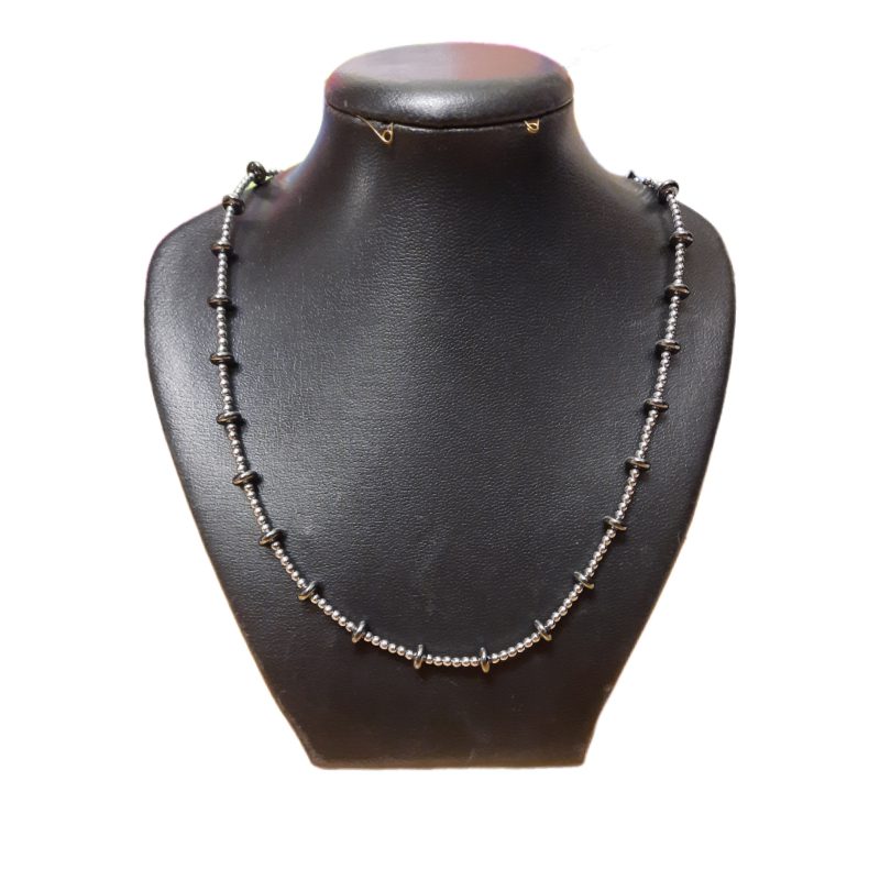 هر دو شکل به کار رفته در این گردنبند از جنس سنگ طبیعی حدید یا همان (هماتیت) می باشد جالب است بدانید که حدید به نام سنگ خون شناخته میشود. همچنین آن را به نام سنگ ذهن نیز نامگذاری میکنند. این سنگ در فرد آرامش و تمرکز ذهنی به وجود میآورد. به تفکر اخلاق، تفکر منطقی و ریاضیات کمک زیادی میکند